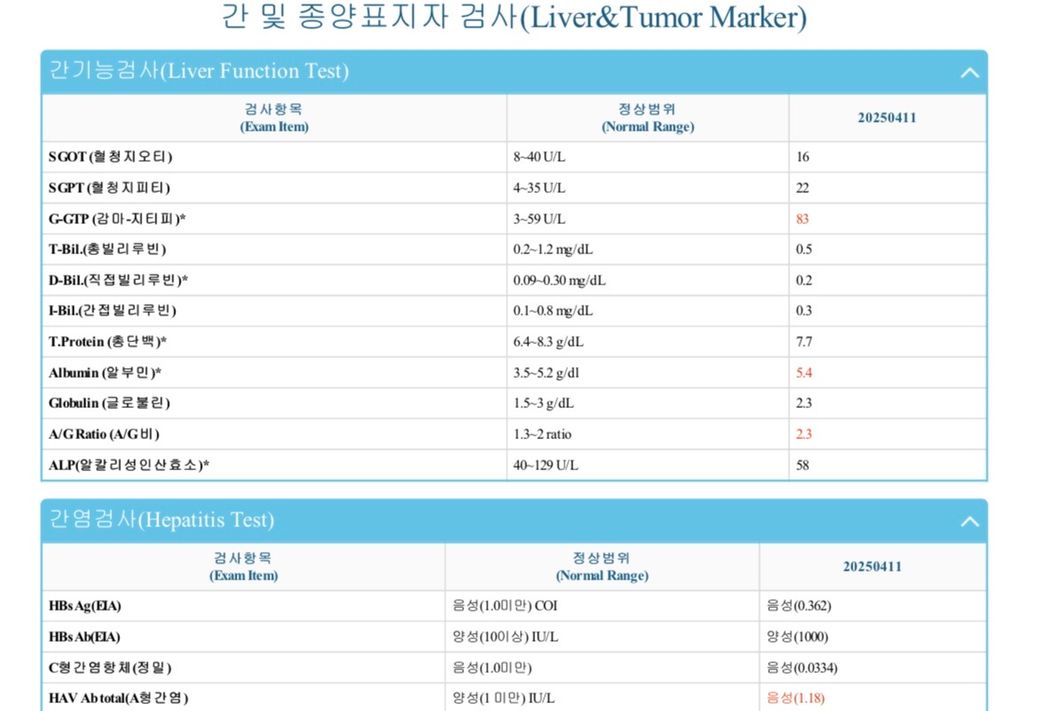 그리고 A형 간염에 대한 항체가 없네요. 백신 접종 권유드려요.