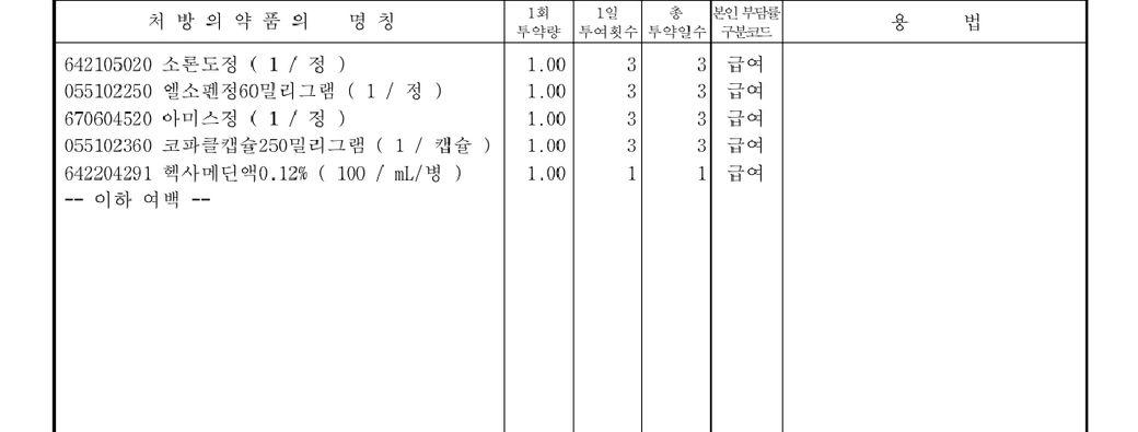 소론도정(염증완화), 엘소펜정60mg(소염진통제), 아미스정(위장약), 코파클캡슐250mg(항생제)이며 헥사메딘액은 소독약입니다.