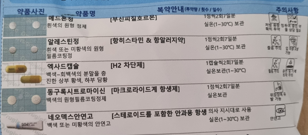 약 봉투에 표기된 약들은 스테로이드 염증약과 항생제, 항히스타민제와 위장약 등입니다.