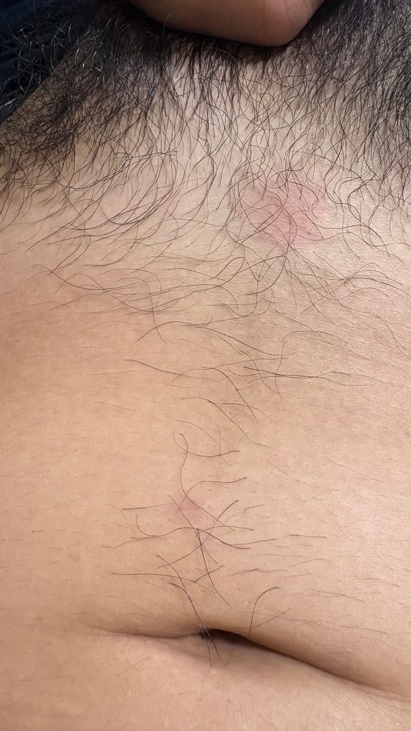 사진상 병변은 치골 상부 털이 있는 부위에 국소적으로 붉고 약간 융기된 병변으로 보이며, 중심 농포는 뚜렷하지 않지만 압통이 약간 동반된다는 점에서 초기 모낭염 또는 경미한 피부 염증 반응 가능성이 가장 높습니다. 꽉 끼는 바지로 인한 마찰과 습기, 땀에 의해 모낭 주위에 미세 손상이 생기면서 발생하는 경우가 흔합니다.