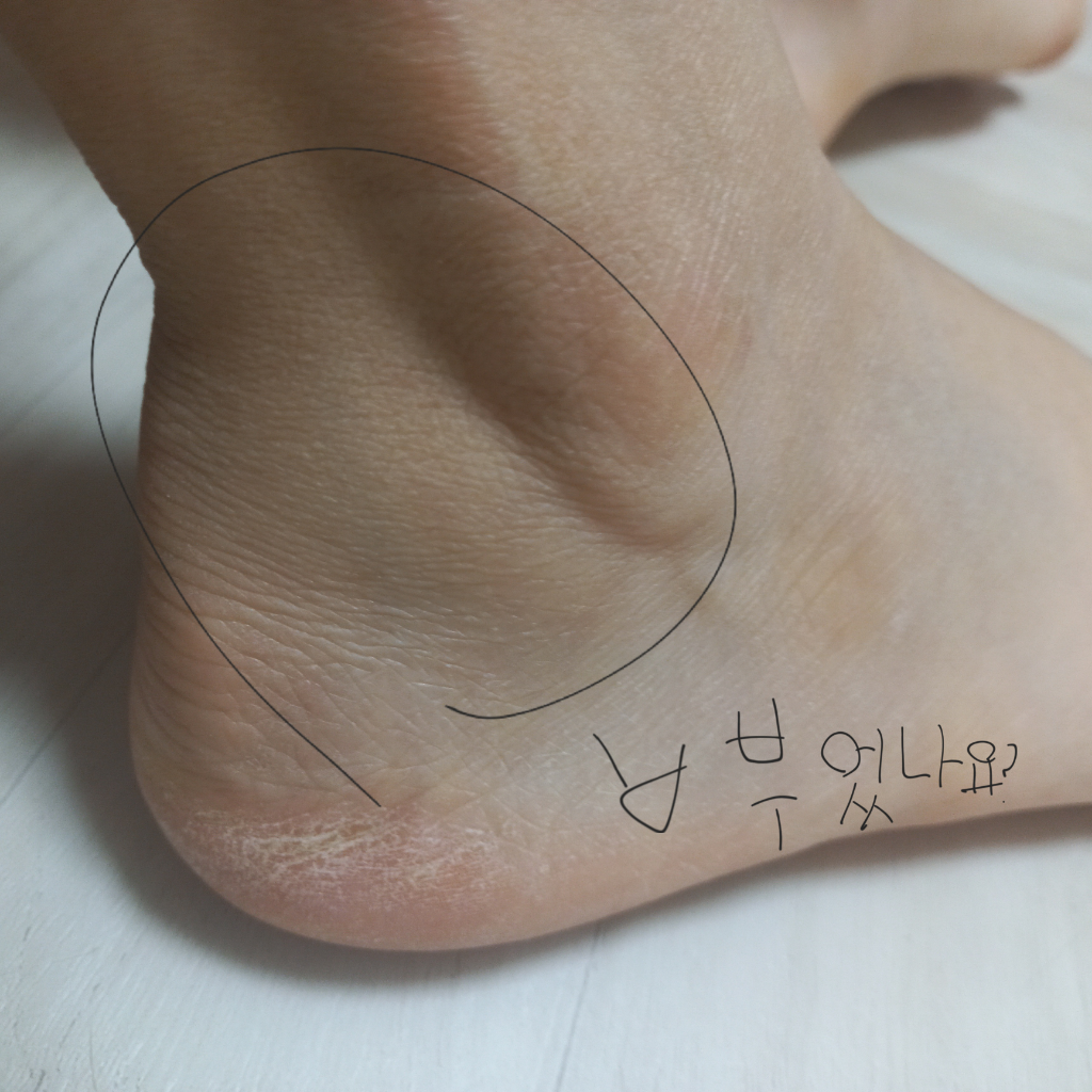 오른쪽 발목이 아파요 근데 엄마가 만져보긴에는 부었다고 하는데 사진상으로 부었나요? 멍든 것 처럼 걸으면 아프요 그리고 여기도 아파요