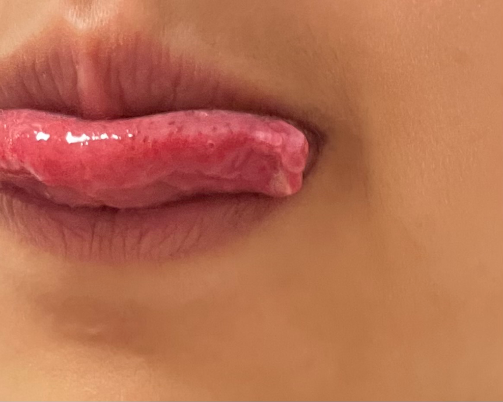 구내염으로 의심됩니다. 일반적으로 구내염은 일반적으로 혀, 주변, 입천장주변,목구멍 주위, 목젖 주위 편도와 부위로 주로 보이는 쪽에 아프타성 궤양, 편도주위 궤양, 또는 설염 또는 수족구병, 바이러스 수포성 질환등으로 분류됩니다. 헤르페스바이러스에 의한 포진도 의심할 수 있습니다. 피곤하고 힘들고 스트레스가 누적될 경우 잘 발생하기도 합니다.