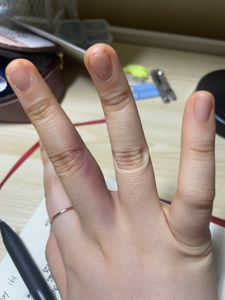 오른쪽 중지 마디가 5일 저녁때쯤부터 빨갛게 (보라빛이돌기도 했고) 부어올랐고 누르면 통증이 느껴집니다 7일에 동네 정형외과에 가서 엑스레이와 초음파를 봤고 엑스레이는 문제가 없는데 초음파를보니 안에 조금 물이 차있고 혹이 보인다 하셨습니다 진단명은 정확하게 말씀안해주셨고 항생제를 처방해주셨습니다 지금은 부기는 꽤 가라앉았으나 멍이 퍼지고있고 혹이 명확하게 동그랗게 만져집니다 이건 무슨병인가요?큰병원에 가야할까요?
