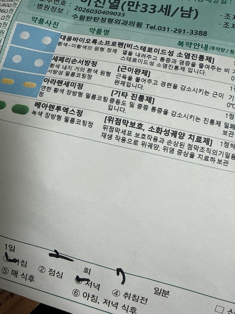 허리디스크 때문에 푸로싹이라는 나프록센 알약을 한알 복용했고 점심 12시쯤 복용했는데 병원에 갔다와서 처방받은 다른 약이 있거든요 사진에 있는 약들인데 밥을 이제 먹어서 지금 복용해도 되나요? 나프록센 복용한지 5시간정도 밖에 안되긴 했어요
