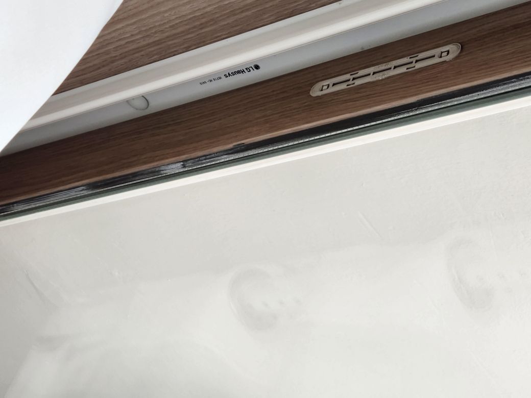 창문 실리콘 부분에 하얀게 생긴 부분은 실리콘 곰팡이 같습니다 락스를 묻힌 수건으로 잘 딲아내면 없어집니다