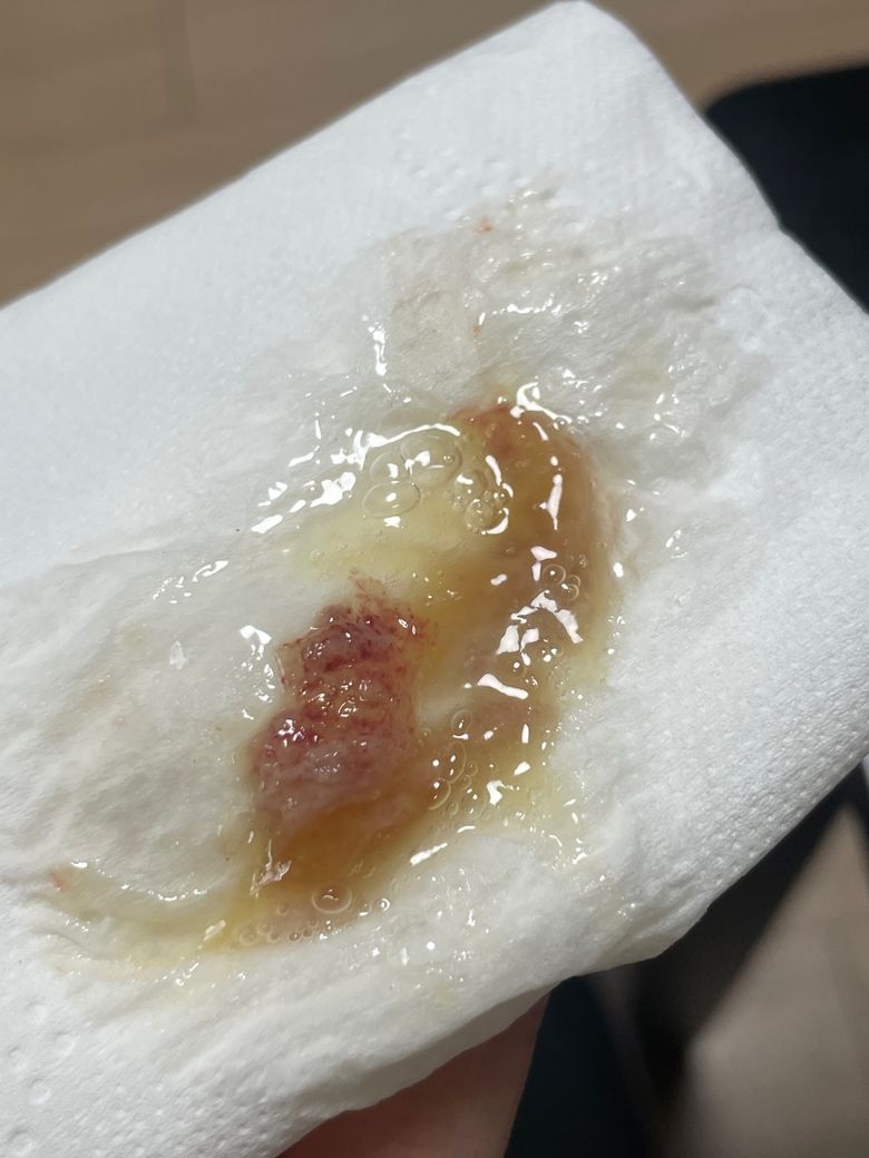 오늘 아침에 일어나서 목에 뭔가 막혀있는 느낌이라 칵 하고 가래를 뱉었는데 점성이 높고, 피가 섞인 가래가 나왔습니다.