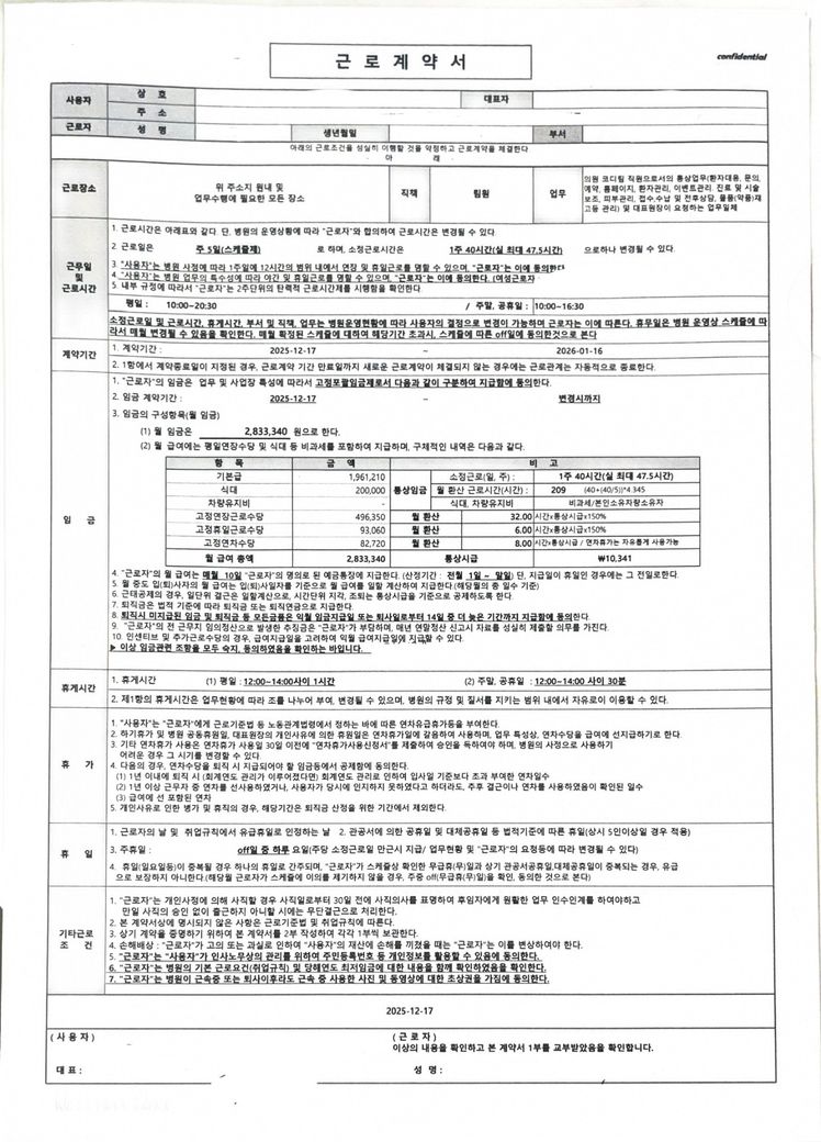 제 근로 계약서이구요 이 계약서를 바탕으로 설날에 유급휴무가 아닌지 확인 부탁드려요ㅠㅠ제가 일하는 것이 5인이상 사업장인데 포괄임금제이기 때문에 설날에 병원이 쉬기 때문에 우리 휴무를 사용하여 휴무를 짜라고 하는데 왜 그랬어야만 했는지 그게 맞는말인지 모르겠어요. 원장은 설날에 3일 쉬는거에 하루는 주급휴무이고 하루는 무급,나머지 하루만 유급이다 .어디에 물어봐도 그렇다라고 하는데 저는 이해가 안가는 부분입니다.
