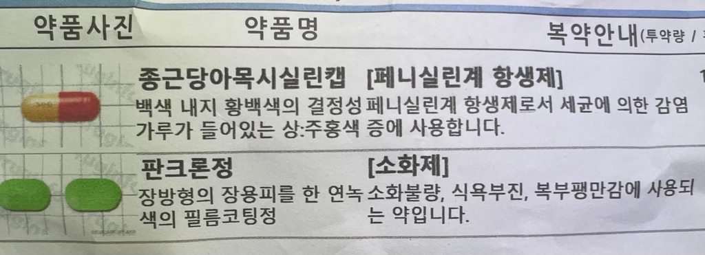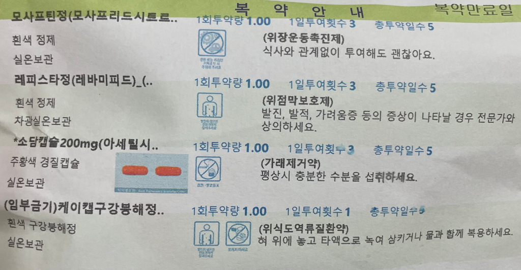 현재 복용 중이신 모사프틴정 / 레피스타정 / 소담캡슐 / 케이캡구강붕해정 / 아목시실린캡슐 / 판크론정은