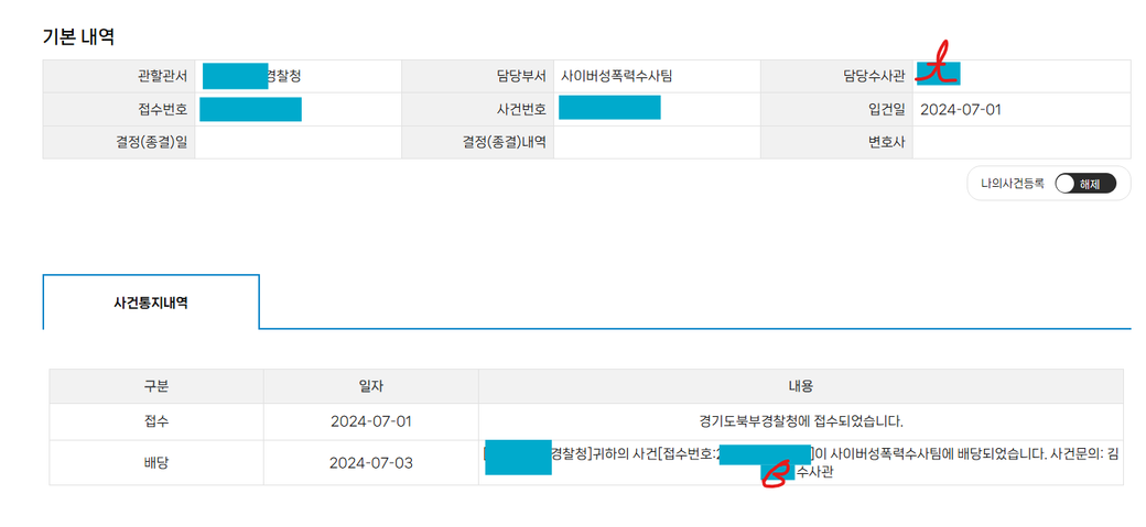 해당 사건이 접수된 후에 배당되었음으로 배당된 사건의 수사관에게 문의하시면 될 것으로 보입니다