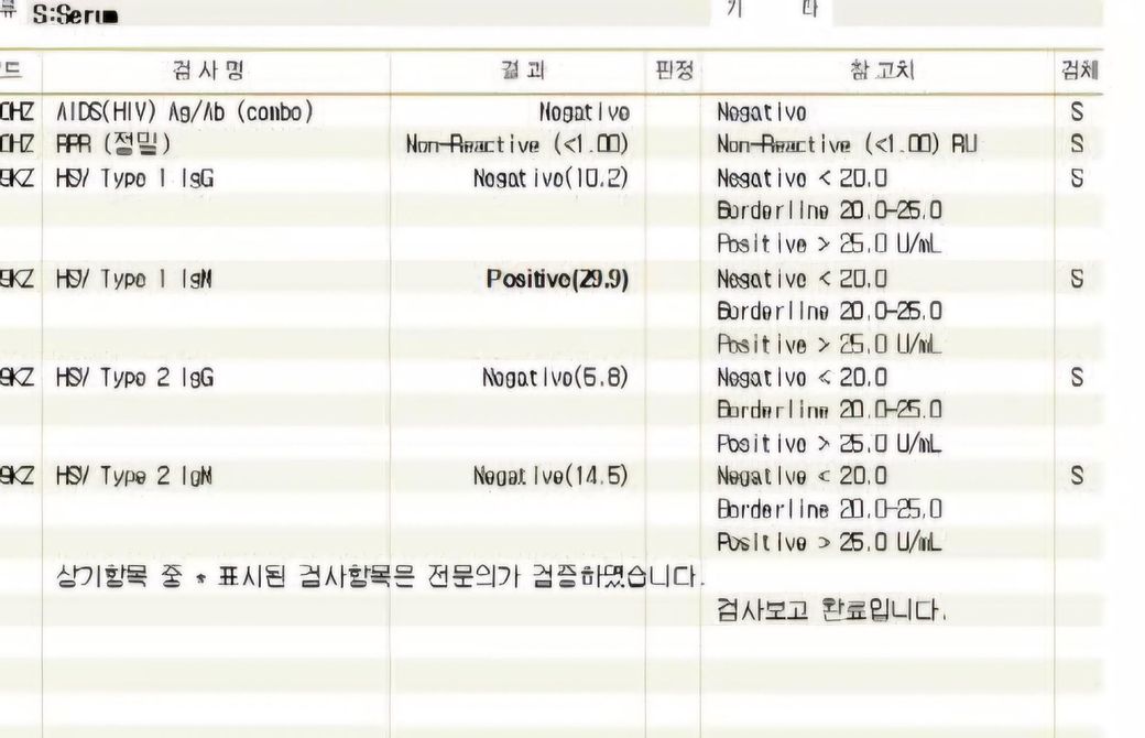 검사한 병원에서 자세히 설명을 안해주셨나봅니다. 에이즈,매독, 헤르페스 2형은 정상인데 헤르페스 1형에 감염된 것으로 추정됩니다.