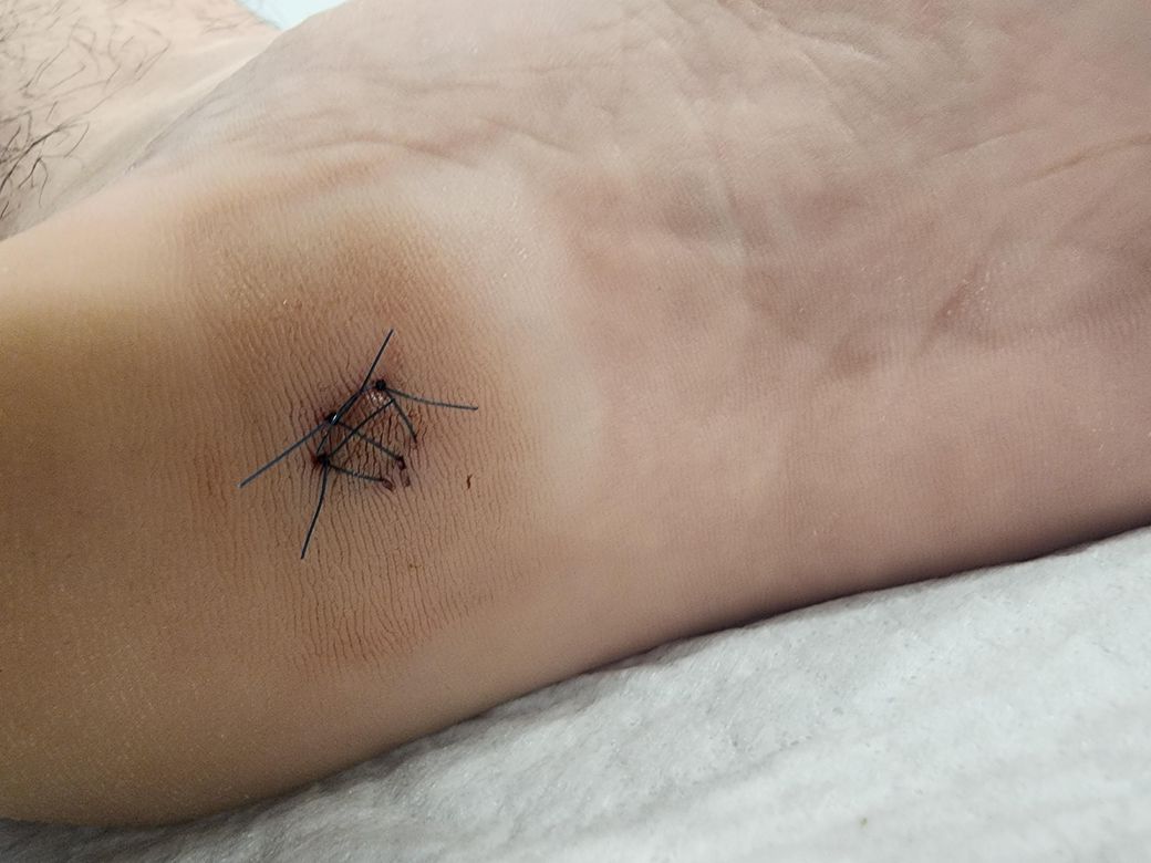 아주 약간씩 꼬맨 부위 사이로 피가 새어나오는데