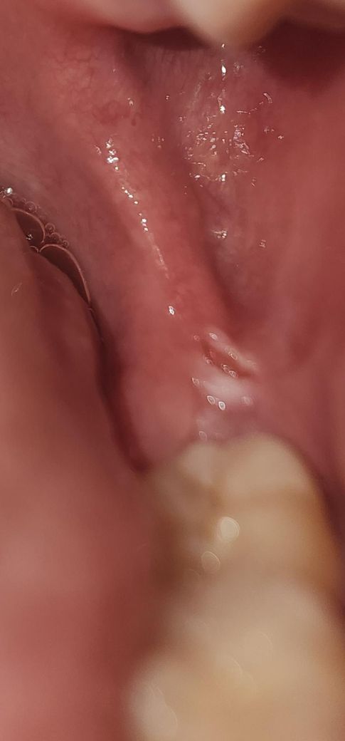사진상 어금니 뒤 점막에 얕은 궤양 형태가 보이며, 경계는 비교적 뚜렷하고 주변 발적이 경미한 상태로 보입니다. 전형적인 아프타성 구내염 형태와 크게 벗어나지는 않습니다.