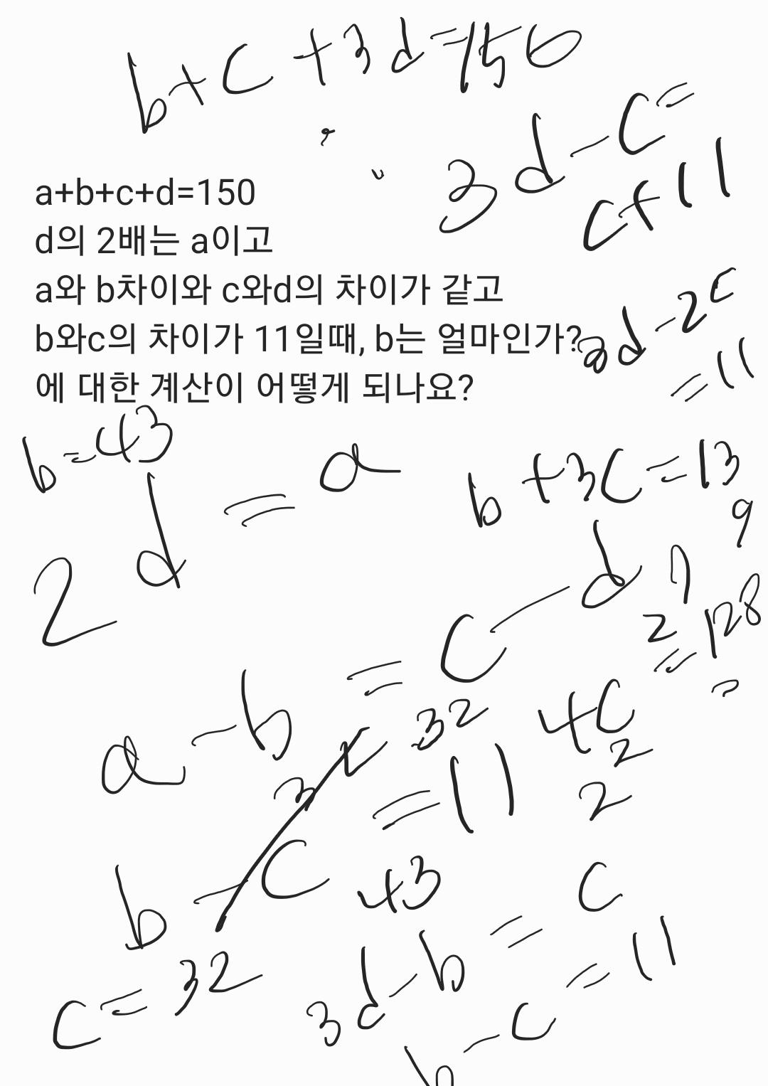 식 3번과 4번을 이용하여 b를 c로 나타내 봅시다. 식 3번에서 b = a + c - d이고, 이를 식 4번에 대입하면 다음과 같습니다.