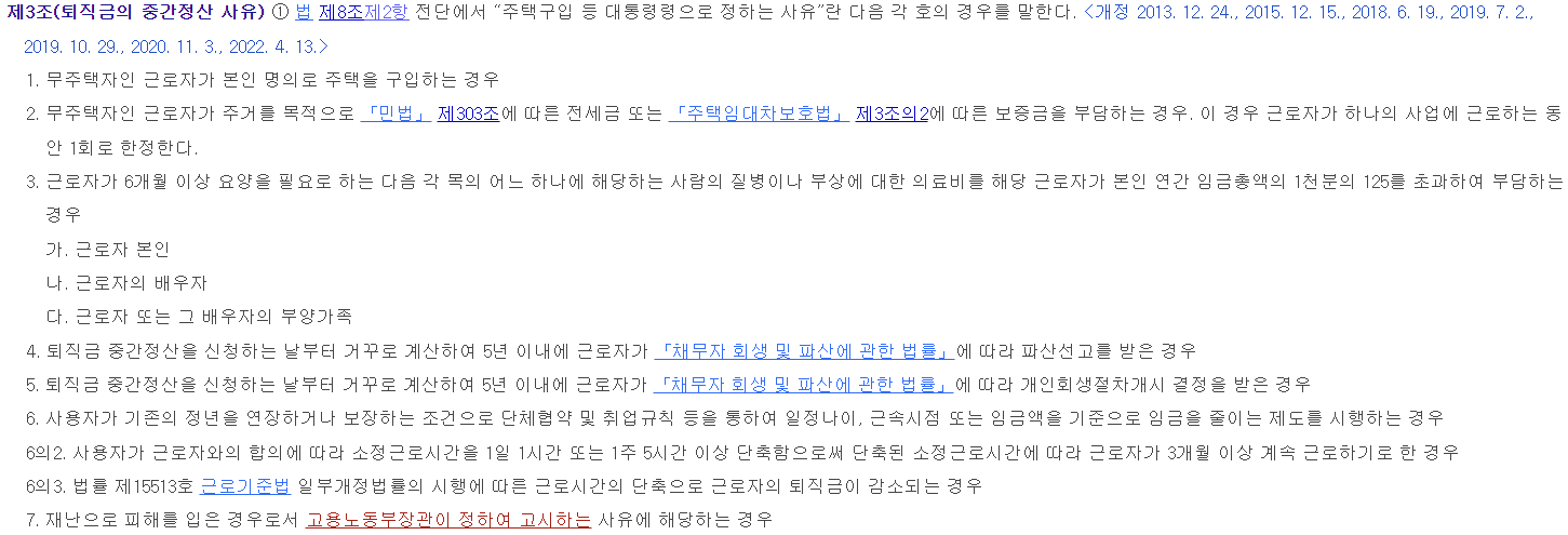 퇴직금 중간정산의 경우 근로자퇴직급여보장법에 따라 정해진 중간정산 사유에 해당해야 퇴직금 중간정산이 가능할 수 있습니다.