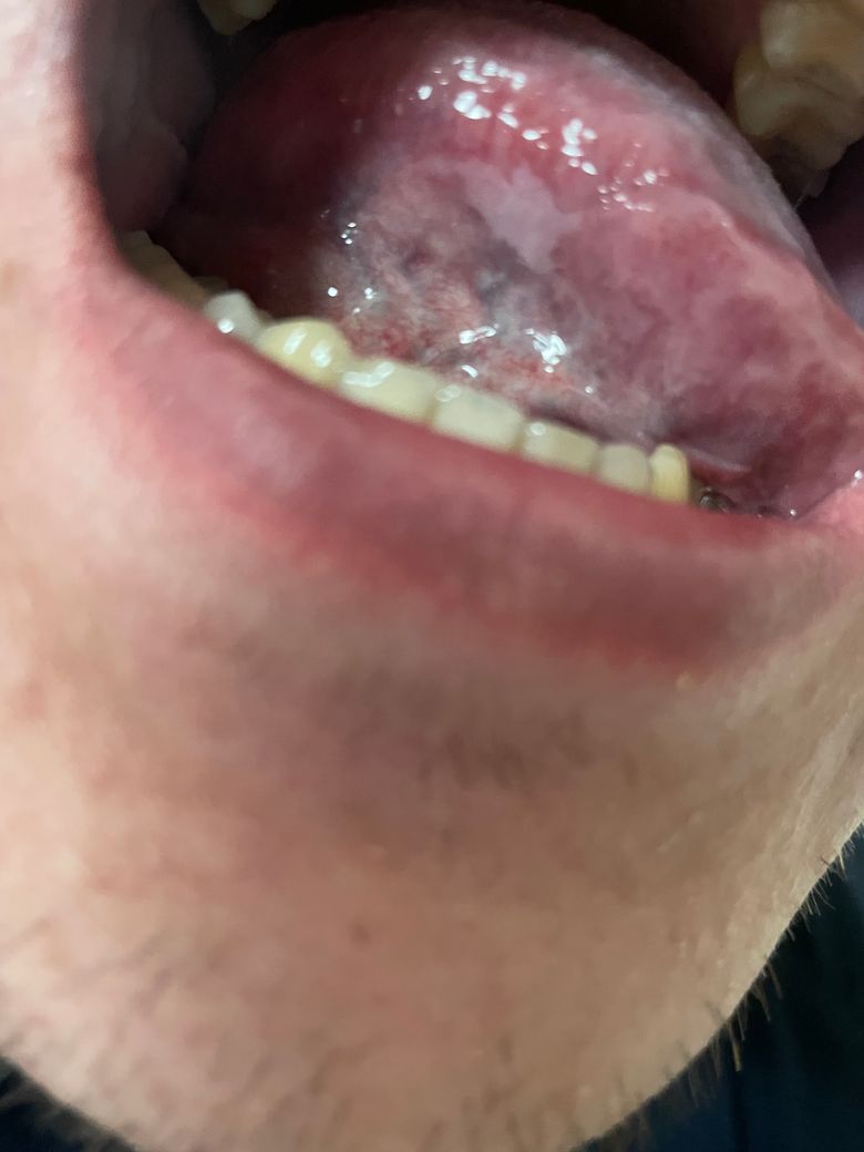 해당 부위에는 정맥 혈관이 많이 지나기 때문에 어두운 색을 보일 수 있습니다 크게 문제가 되지 않을 것으로 생각됩니다 걱정이 되신다면 치과에서 진료를 받아 보는 것을 권유 드립니다
