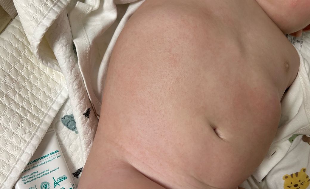 사진에서 보이는 병변은 복부에 미세한 붉은 구진들이 넓게 퍼져 있는 형태로, 전형적인 음식 알레르기 두드러기보다는 땀띠 또는 열성 발진(태열)에 더 가까운 양상입니다. 두드러기형 알레르기 반응은 보통 경계가 비교적 뚜렷한 팽진 형태로 올라오며, 갑자기 생겼다가 수 시간 내 위치가 바뀌거나 사라지는 경우가 많고 가려움이 동반되는 경우가 흔합니다. 사진에서는 그런 팽진 형태보다는 잔잔한 구진성 발진 양상입니다.