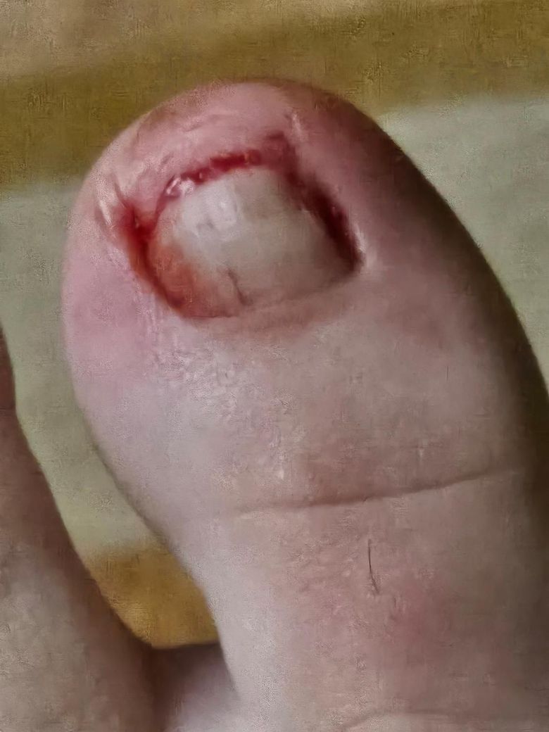 사진상으로는 정확한 상태 파악이 어렵지만 내성발톱으로 인해서 직접 상처 부위를 뜯어낸 경우 감염의 위험이 높기 때문에 적절한 조치가 필요할 것으로 생각되니다.