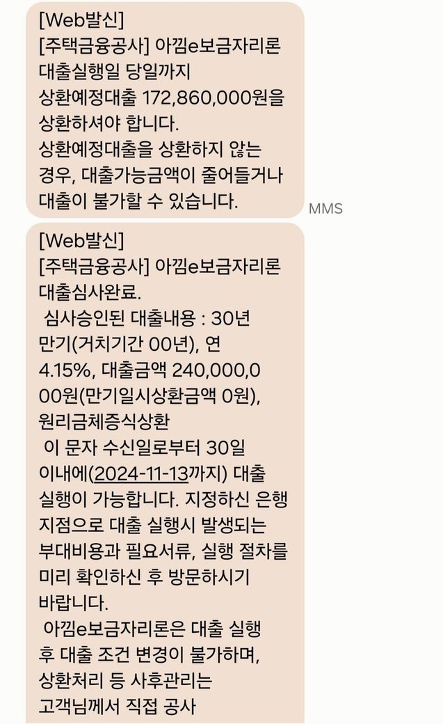 위 문자 내용을 보면, 2억 4천만 원 대출을 받기 위해 먼저 172,860,000원의 중도금 대출을 상환해야 한다는 내용입니다. 즉, 중도금 대출을 상환하지 않으면 대출 가능 금액이 줄어들거나 대출이 불가할 수 있습니다. 따라서 계획대로 2억 4천만 원을 받기 전에 중도금을 미리 상환해야 대출이 정상적으로 실행될 수 있는 상황입니다.