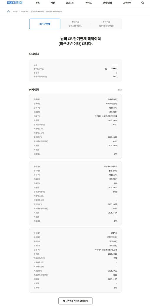 * 25년 10월 중순쯤에 현대,롯데,삼성 카드값을 차례로 연체하였습니다.