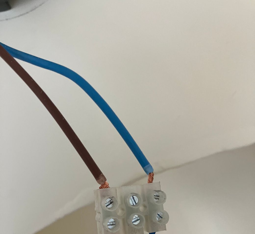 사진에서 보이는 벽면에서 나온 전선은 청색, 갈색이 있었구요. N상이 청색, L상이 갈색으로 알고있어서 연결했습니다.신품 전등에는 하얀색,검정색,녹색 선이 있습니다.