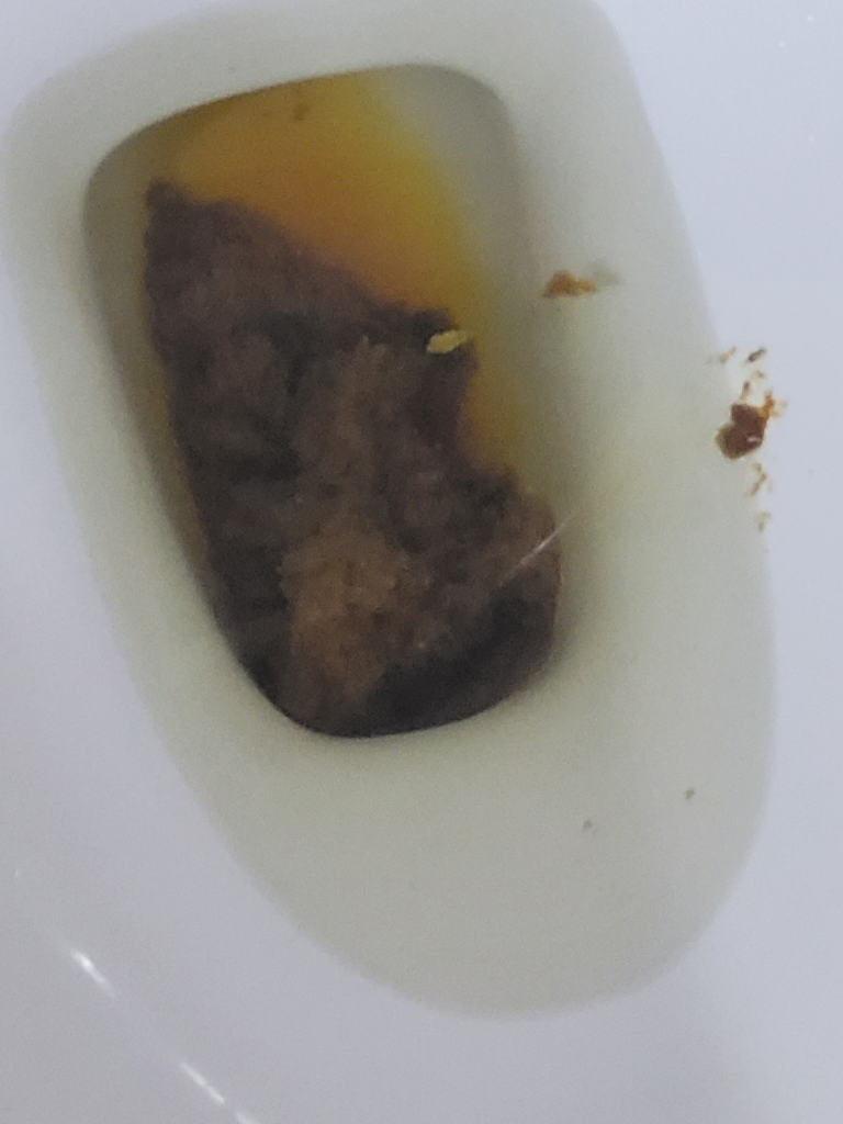 어두워서 잘 보이지는 않지만 혈변으로 추정할만한 부분은 없어보입니다. 검은 알갱이처럼 보이는 부분들은 음식물로 인한 변의 색이므로 걱정할만한 것은 아닙니다.