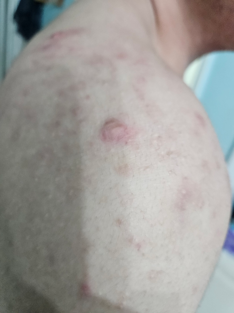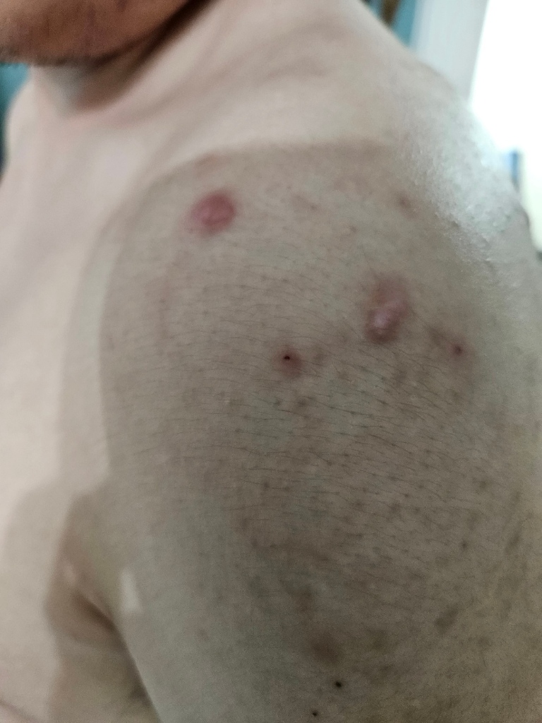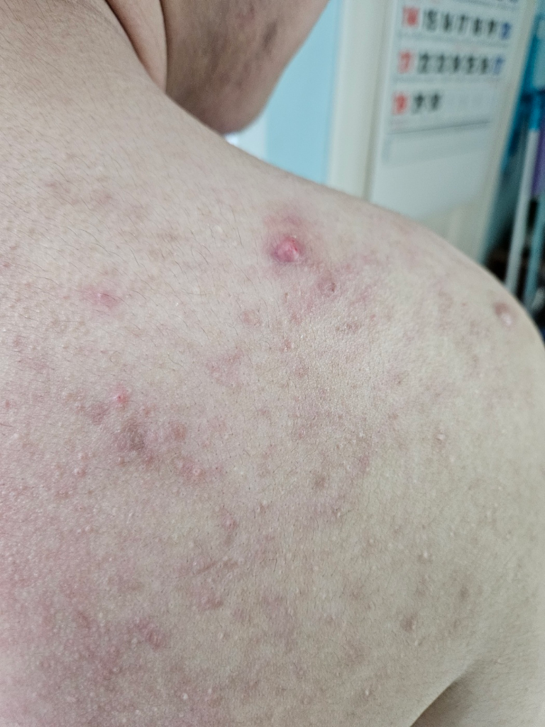 몇 주 간격으로 피부에 여드름?모낭염? 같은게 하나씩 올라오는데 보통 가슴쪽, 어깨나 어깨 후면, 등 가운데 많이 나고, 염증이 차 부풀어 오르면 한손 집게손 모양으로 짜낸 다음 후시딘을 발라줬습니다.