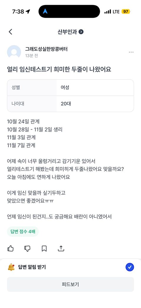 얼리 임신테스트기 희미한 두줄이 나왔어요