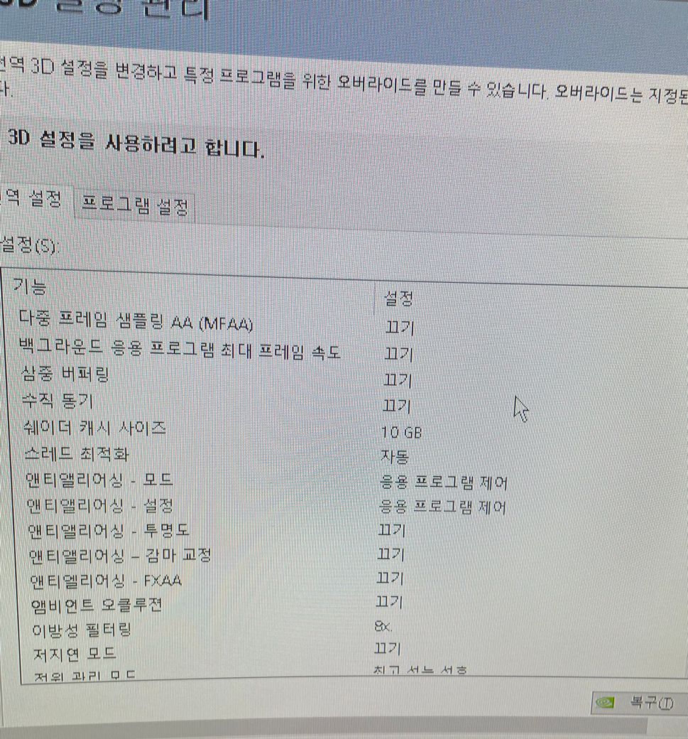 NVIDIA 제어판 3D 설정 관리에서 옵션을 우선 적용 해보세요.