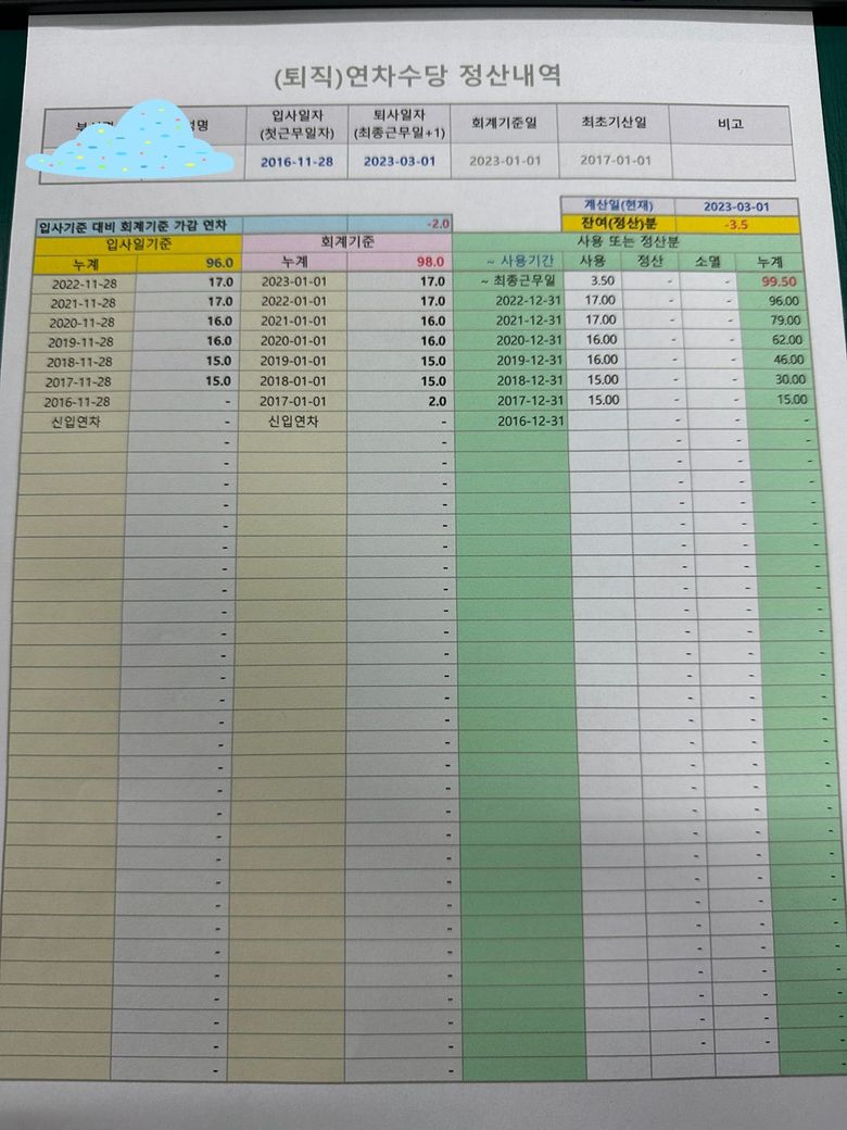 그렇다면 결국 총 96개의 연차가 발생하므로 사용한 연차일수가 맞다면 회사의 계산도 맞아보입니다.