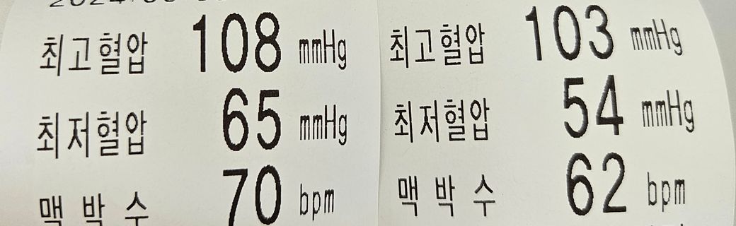 예전에 쟀을때는 최저혈압 80대쯤, 최고혈압 90후반대였습니다. 근데 오늘 다시 재보니 좀 많이 바뀌었더라고요. 이정도면 괜찮은 편인가요? 왼쪽은 첫번째 잰거, 오른쪽은 두번째 잰것입니다