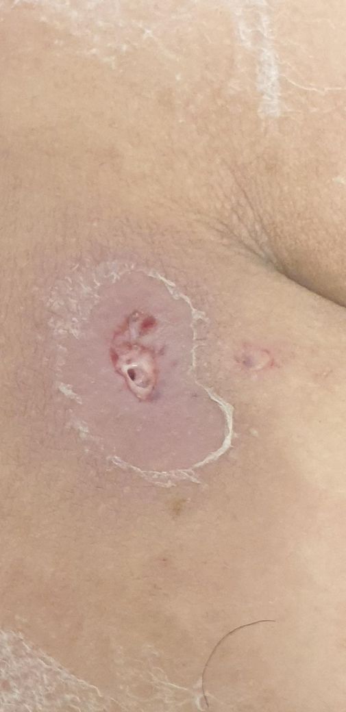 안녕하세요, 목요일에 표피낭종이 터져 외과에서 수술을 받았습니다. 봉합하지 않고 상처관리중입니다. 오른쪽 작은 구멍이 수술부위구요, 왼쪽 큰구멍쪽이 낭종이 터져나온 구멍입니다. 오늘 드레싱하려다 상처를 보니 왼쪽 상처 주변 흰색 불투명한 액체같은게 보이는데 감염된건가요? 열감이나 그런건 없고,환부가 간지러운 증상은 있고 통증은 눌리거나 비벼질때 쓰라린정도로 있습니다.