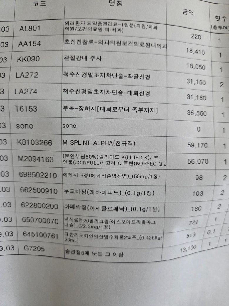 사진에서는 관절강내주사, 리도카인등이 염증완회목적의 주사이고, 릴리이드K가 있는 항목이 재생주사성분으로 보입니다.