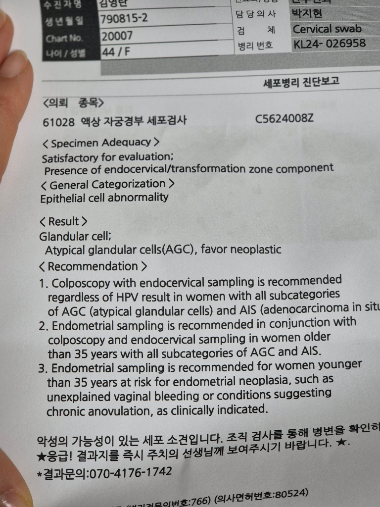 PAP 검사에서 비정형선상피세포 소견이며 암이 의심됩니다