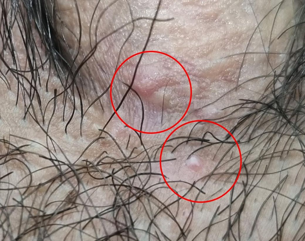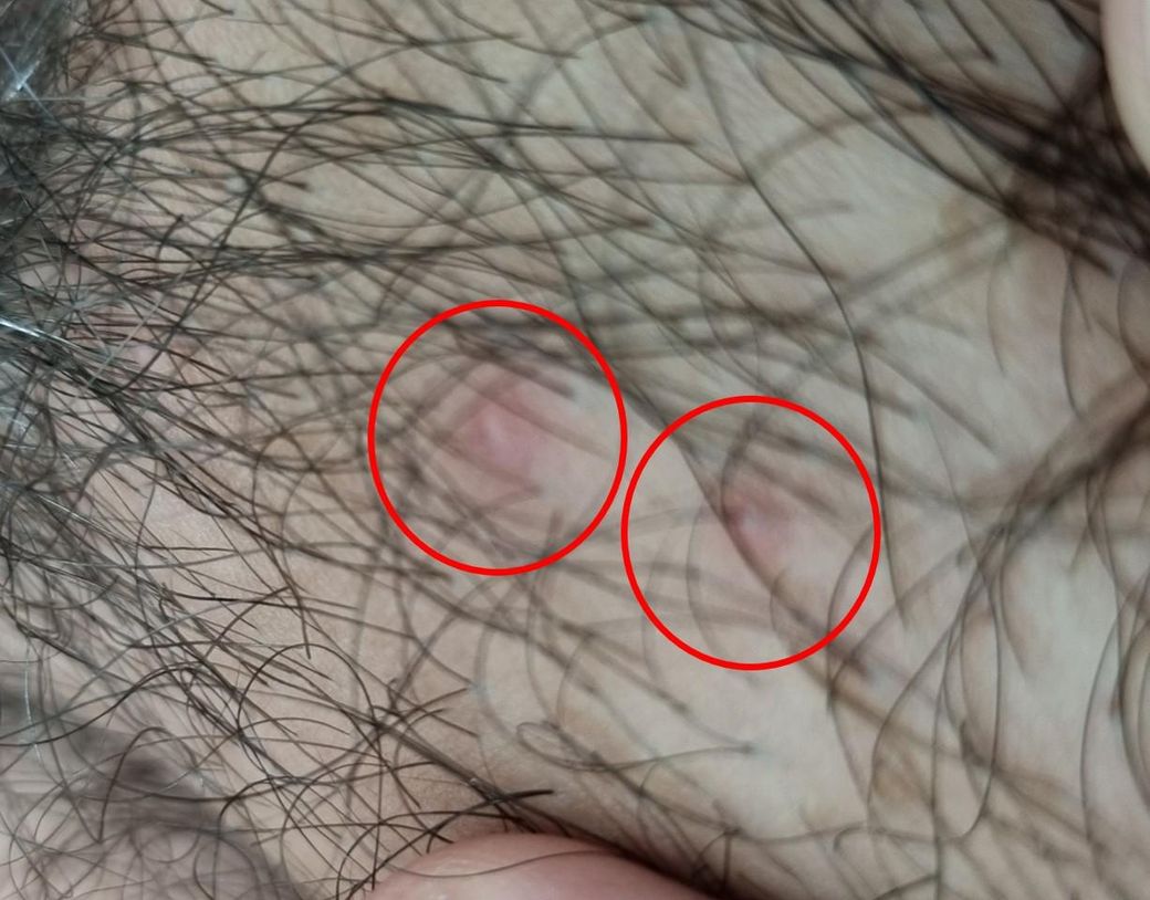 올려주신 사진상 발진을 동반한 작은 구진이 관찰되는데 병변의 양상이나 발생 위치를 볼 때 모낭염과 같은 국소 염증성 병변 가능성이 있습니다. 만약 가려움이 있다면 국소 피부염을 감별해야 합니다. 수포성 병변이거나 사마귀양 병변이 아니므로 헤르페스 감염이나 곤지름과 같은 성매개성 피부 질환 가능성은 낮을 것으로 판단됩니다. 따라서 병변의 변화가 나타나는지 너무 걱정하지 말고 경과 관찰을 해보시는 것을 권해드립니다.