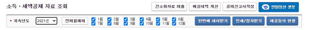 위의 경우 1~6월, 11월~12월 분을 체크하셔서 연말정산 자료를 다운로드 하시면 됩니다. 연말정산은 근로소득자의 근로소득을 대상으로 하므로 근로자가 아니었던 기간인 4개월은 제외합니다.