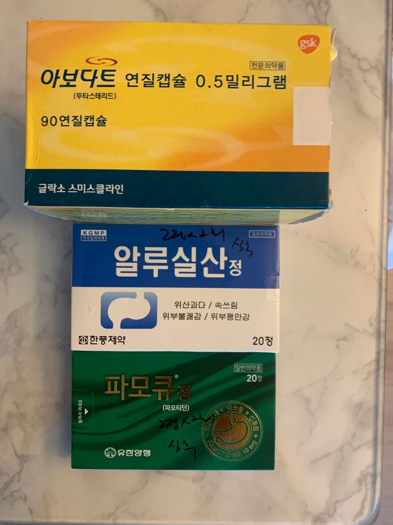현재 복용하시는 탈모약인 아보다트의 두타스테라이드 성분은 위장약과 서로 상호작용이 보고되지 않았으므로 같이 복용하셔도 무방합니다.