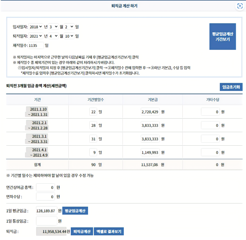 고용노동부 퇴직금 계산기를 통해서 월 고정급여 3,833,333원인 직원의 퇴직금을 계산하니까 아래와 같이 나오는데요.