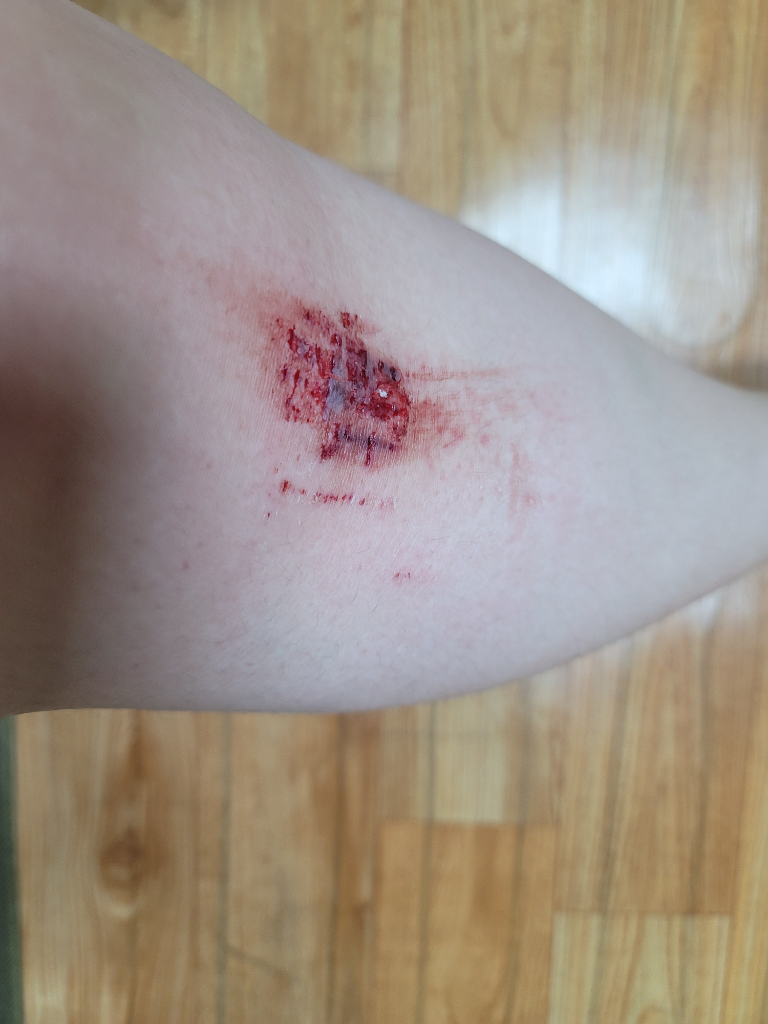 상처가 나고 출혈이 나고 있다면 깨끗한 흐르는 물에 씻은 다음 베타딘(빨간약)으로 소독해주시고 후시딘이나 에스로반 같은 항생제 연고를 바르고 위에 거즈나 메디폼으로 덮어주시면 됩니다.