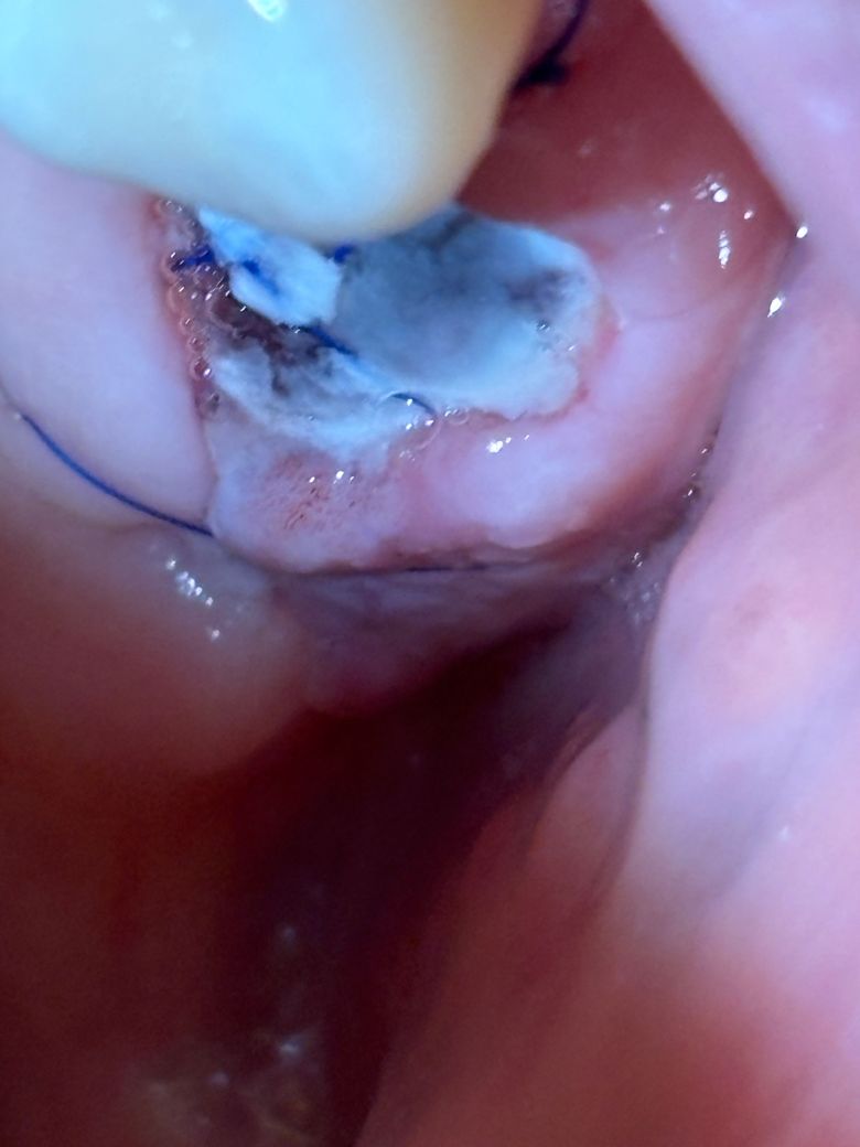 사진을 봤을 경우 수술한 부위가 부어있는것으로 보입니다. 해당부위를 자극하지 않으면 대부분 잇몸은 아물기때문에 가능하면 수술부위가 자극되지 않도록 하는것이 좋습니다.