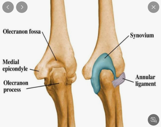 아래 그림에서 olecrenon 이라고 표시한 부분이 팔꿈치에서 가장 뾰족한 부위입니다. 사진을 찍어서 보여주신 팔꿈치를 보면 주름이 많이 잡혀있는 부위를 이야기합니다. 그 좌우로 움풀 파여있다보니 피부가 덮어진 후에도 파임이 생기는겁니다.