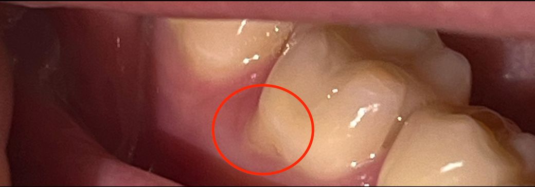 근데 오늘 갑자기 거울 봤는데 사진처럼 치아 밑부분에 살짝 색깔 다른 부분이 보여서 눌러봤는데 살짝 아파요..