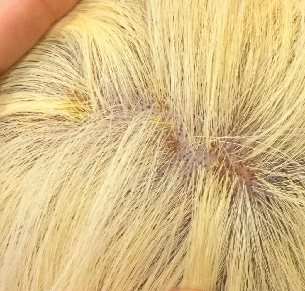 병태생리적으로 탈색제의 과산화수소 및 알칼리 성분이 두피 장벽을 손상시키면서 표피 염증과 삼출이 발생한 상태로 보입니다. 이 정도 깊이라면 대부분 표재성 손상에 해당하며, 진피 깊은 층까지 손상이 진행된 소견은 아닙니다.