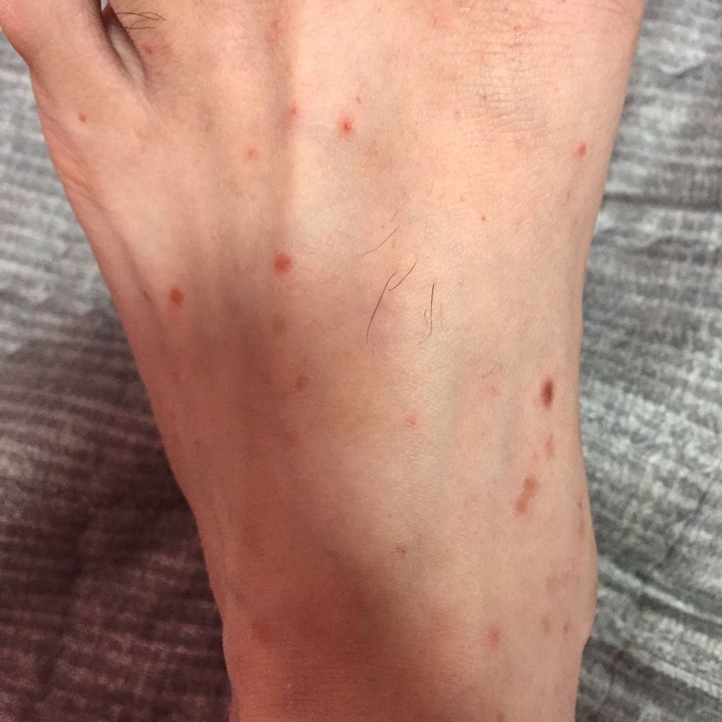발등에 이상한 붉은 반점들이 생깁니다.