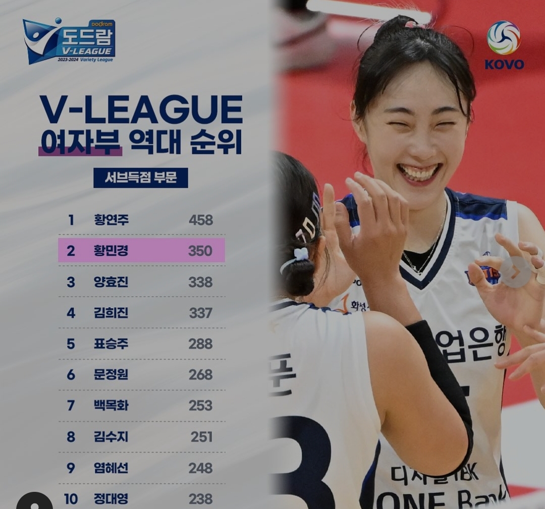 안녕하세요. 역대 서브 득점 통산 1위는 황연주 선수입니다. 보다 구체적인 순위는 해당 사진에 나온 바를 참고하시면 좋을 것 같습니다.
