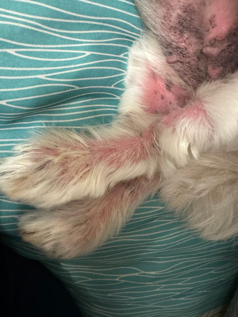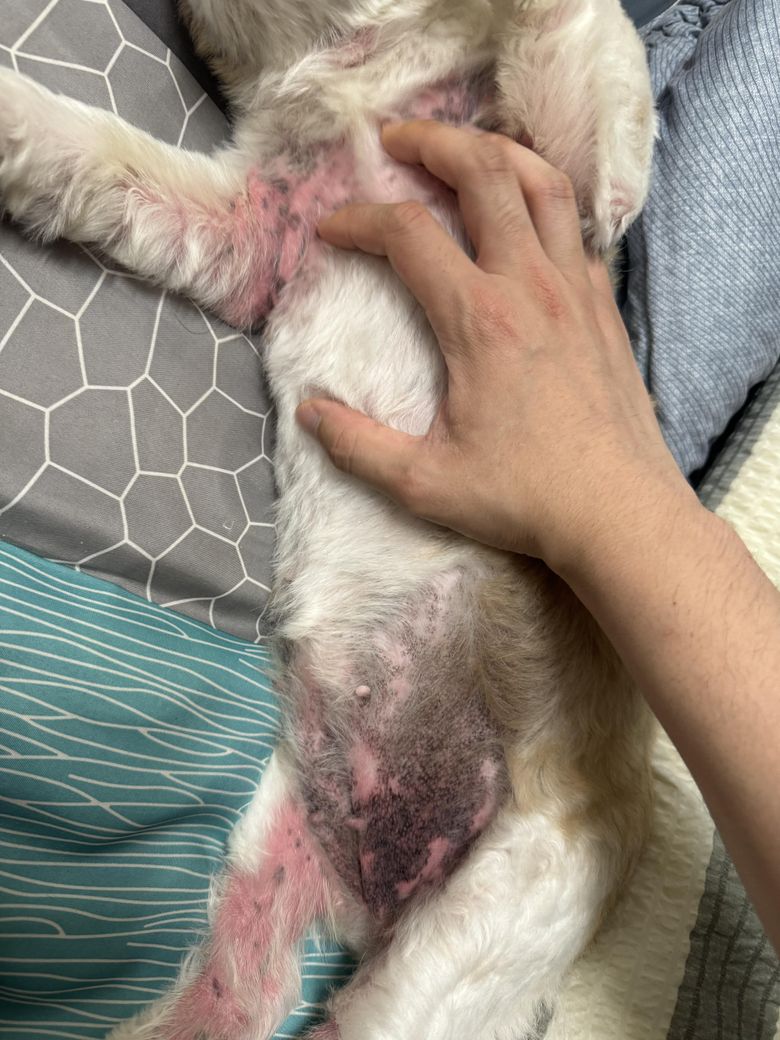 시츄 12살인데 각질도 심하고 피부가 엄청 빨갛게 올라와요. 진물도 나오는거 같아요. 심할땐 피부 빨간곳이 전체다 진물이에요.