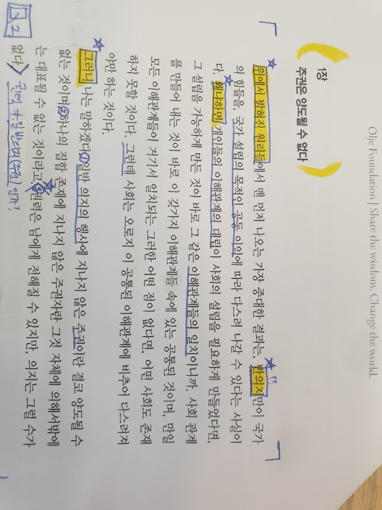 '위에서 밝혀진 원리들'이 무엇인지, 반의지는 무엇인지, 그래서 '중대한 결과'가 나오는 이유에 '왜냐하면' 문장이 들어가는 이유는 무엇인지 궁금합니다. 또 논리를 이끌어내는 부분인 '그러니'에서 논리가 어떻게 도출되는지도 궁금합니다. 마지막으로 1,2,3 동그라미 친 부분의 의미는 무엇인지도 궁금합니다.