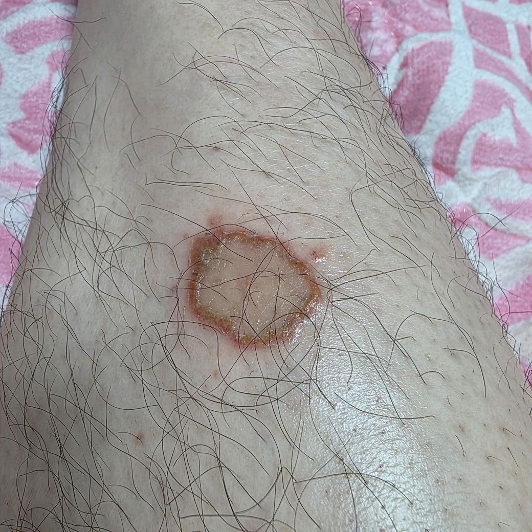 설명하신 병변은 단순 세균성 상처보다는 다른 피부질환 가능성이 더 우선적으로 고려됩니다. 원형으로 경계가 붉고 중심부 색이 변하는 양상은 전형적인 세균 감염보다는 체부백선과 같은 진균 감염에서 흔히 보이는 형태입니다. 현재 처방받으신 베아로반 연고는 세균 감염 치료용 항생제 연고로, 이런 경우에는 효과가 제한적일 수 있습니다.