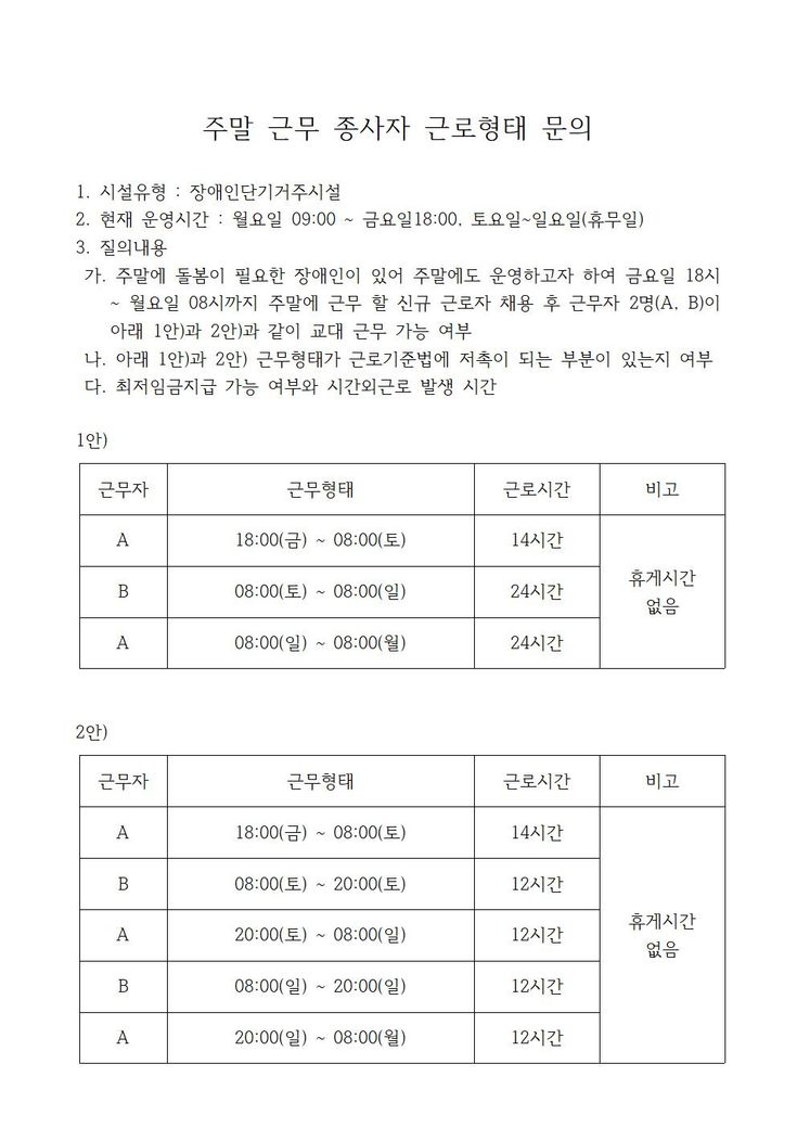 가. 주말에 돌봄이 필요한 장애인이 있어 주말에도 운영하고자 하여 금요일 18시 ~ 월요일 08시까지 주말에 근무 할 신규 근로자 채용 후 근무자 2명(A, B)이 아래 1안)과 2안)과 같이 교대 근무 가능 여부