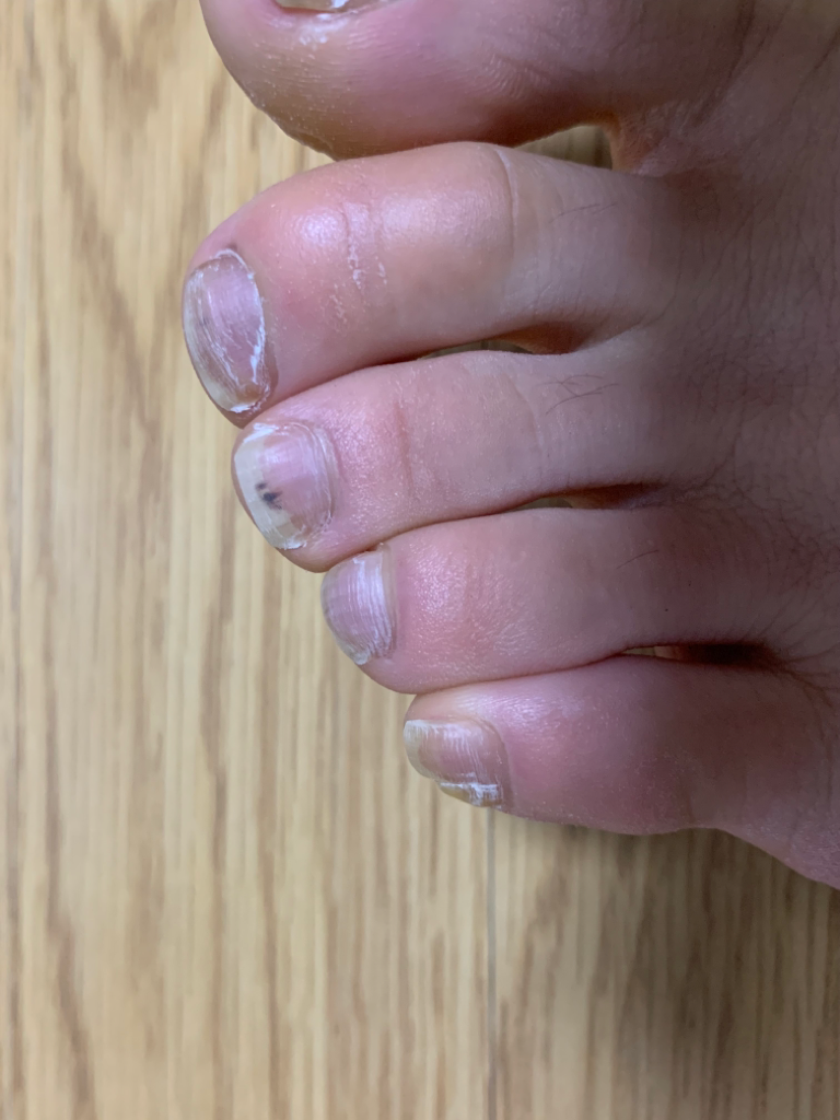 손톱 발톱 사이사이에 발견되는 점 같은 형태는 작은 출혈일 가능성이 많습니다.