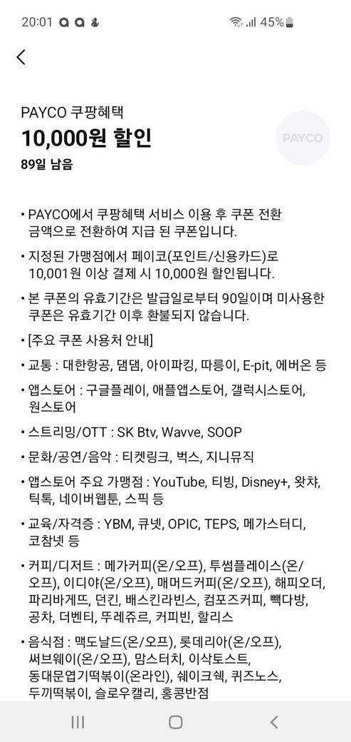 안녕하세요. 페이코에서 쿠팡 쇼핑으로 적립 받은 이 프로 쿠폰은 일반 포인트가 아닌 쿠폰 전환 기능 금액으로 제공되며 아래와 같은 방식으로 사용할 수 있습니다. 페이코 앱 실행 앱 하단 메뉴에서 포인트 쿠팡 혜택 메뉴로 이동 쿠팡 쇼핑하러 가기 버튼 클릭 해당 버 등을 통해 쿠팡에 접속 후 1만원 이상 결제하면 적립 대상이 됩니다. 반드시 페이코 포인트 카드로 결제해야 적립이 적용됩니다. 쇼핑 후 다다음 달 10일에 쿠폰 전환 가능 금액이 적립됩니다. 적립내역은 페이코앱에서 확인이 가능합니다.